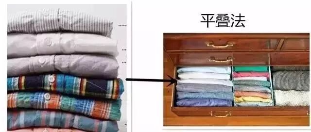 通常我们叠衣服都是一件叠在衣服的上面,然后就一直叠上去,叠的很高,然后再一大叠放在衣柜,那这样导致的结果就是,不好拿衣服,就算拿到衣服,叠起来的衣服也乱了,所以针对这种情况,可以换另一种叠法,平叠法,叠好的衣服竖起来,然后左右叠起,这样的好处是既方便放衣服,也好拿衣服,如下图。