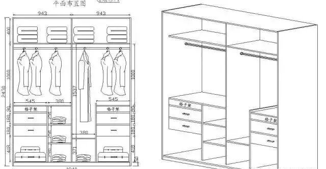 要想设计好内部结构,就要了解衣柜每个功能的尺寸把握,比如说挂大长衣的高度要做到1500mm左右,挂中长大衣的高度做到1100mm左右,挂裤子的高度做到900mm左右,顶部存放被褥区高度做到400mm左右,叠放区高度做到300-400mm左右,抽屉做到150-200mm左右等,总之,设计的原则是根据存放东西的长度,宽度等来把握尺寸。