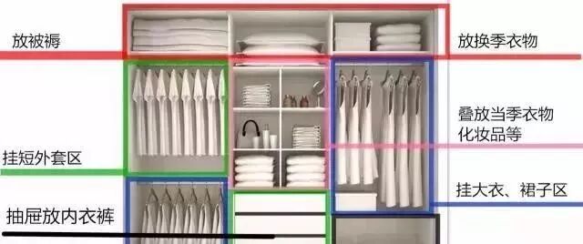 我们知道衣柜主要存放衣物,被褥,包包,饰品等,按功能区分就是顶部存放被褥区,中间是叠放区,悬挂区,抽屉,裤架区,底部收纳区等。